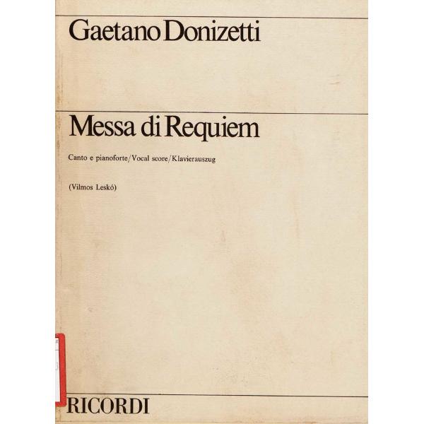 Messa di Requiem : per soli (soprano, contralto, tenore e 2 bassi), coro a 4 voci miste e orchestra / Gaetano Donizetti ; testi in latino e inglese (versione inglese di Geoffrey Dunn) ; revisione e riduzione di Vilmos Lesko [per] cento e pianoforte
