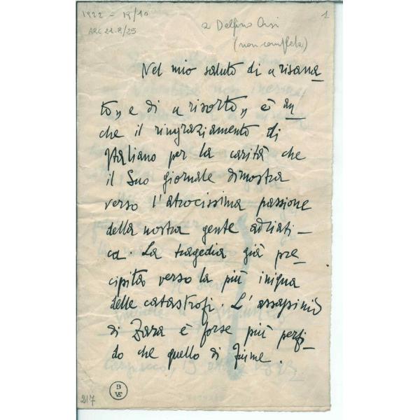D'Annunzio, Gabriele; Tenneroni, Annibale, Lettera mancante della parte iniziale