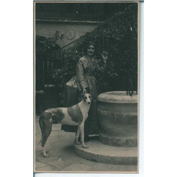 Cartolina postale illustrata con fotografia di Luisa Baccara con cane