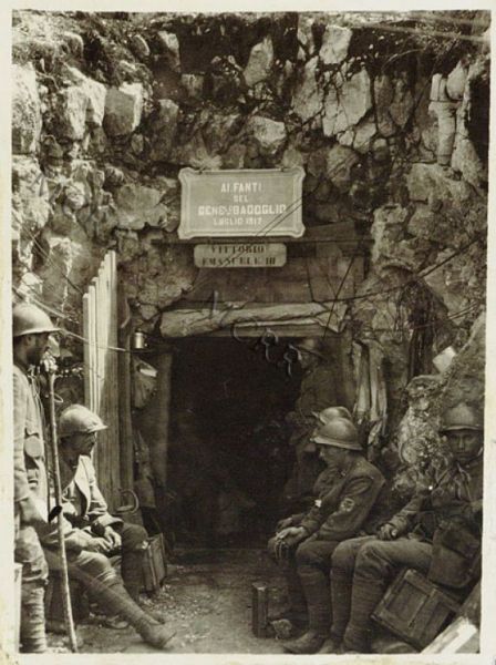 Soldati italiani davanti l'entrata di un rifugio con iscrizione dedicatoria 'Ai Fanti del Gene.le Badoglio. Luglio 1917. Vittorio Emanuele III'.