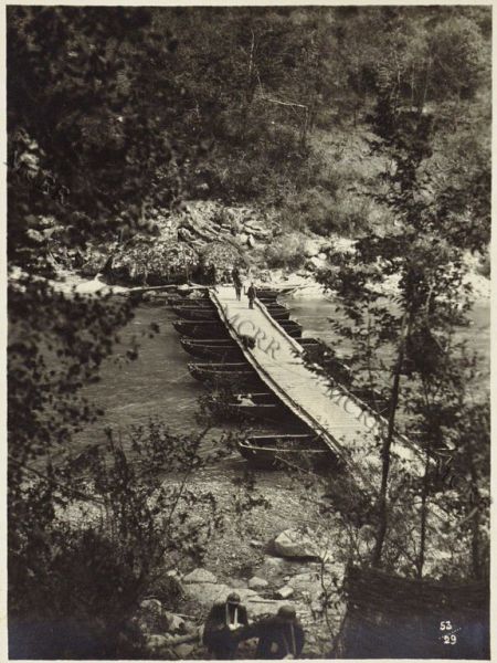Album 53. Offensiva Italiana agosto 1917. Ponte di barche gettato sull'Isonzo a Bodrez.