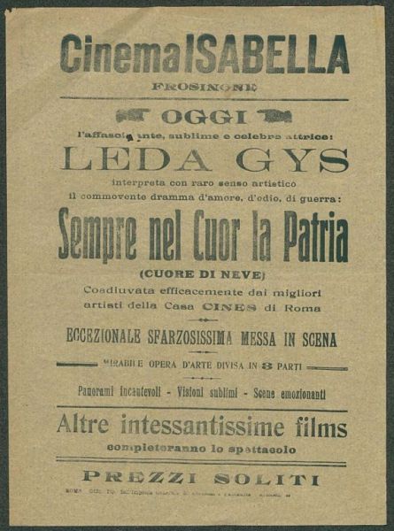 Oggi, l'affascinante, sublime e celebre attrice, Leda Gys interpreta con raro senso artistico il commovente dramma d'amore, d'odio, di guerra, Sempre nel cuor la patria, (cuore di neve) : coadiuvata efficacemente dai migliori artisti della Casa Cines di Roma