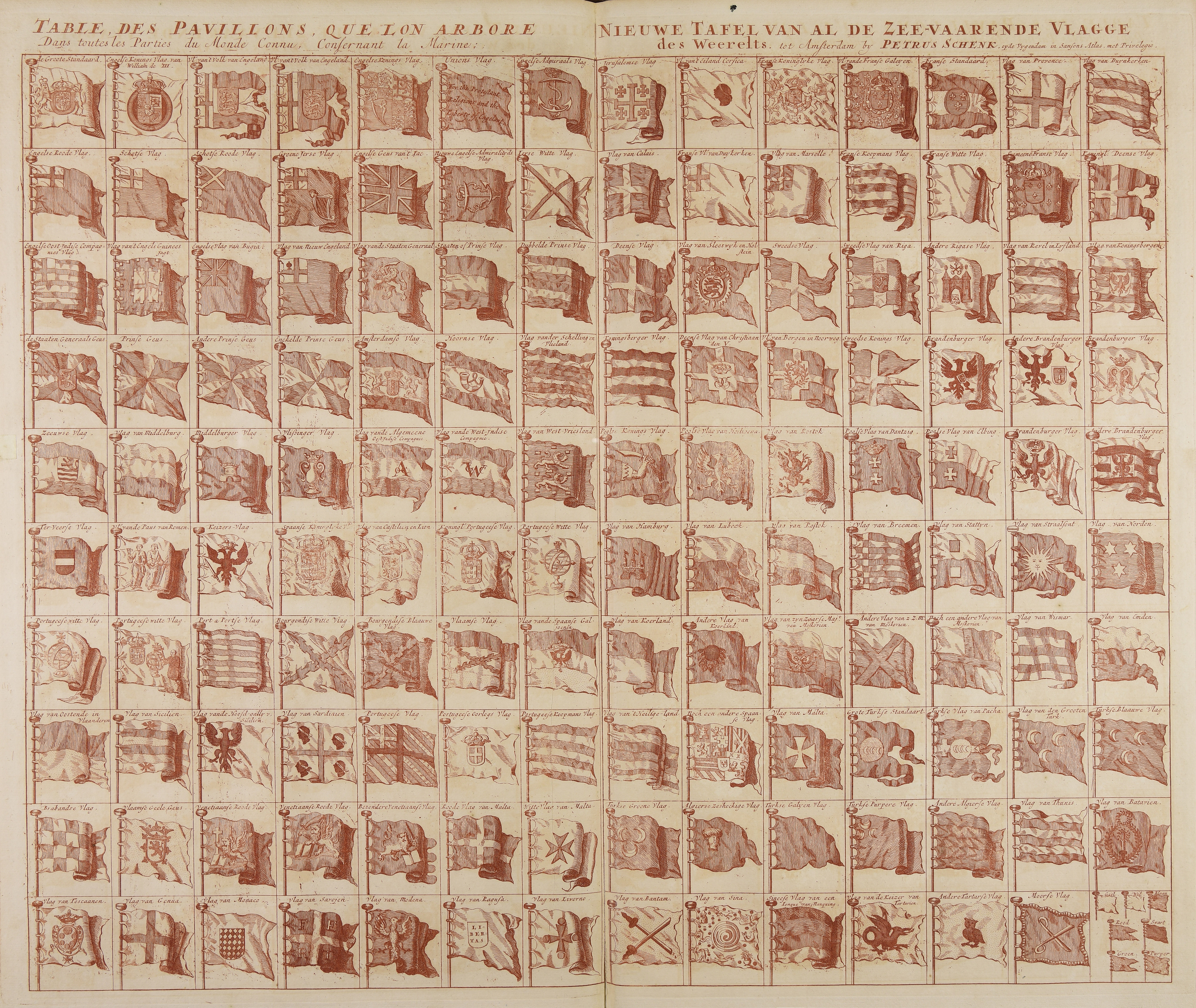 Table des pavillons que l'on arbore dans toutes les parties du monde connu, consernant la marine = Nieuwe Tafel van al de zee-vaarende vlagge des weerelts