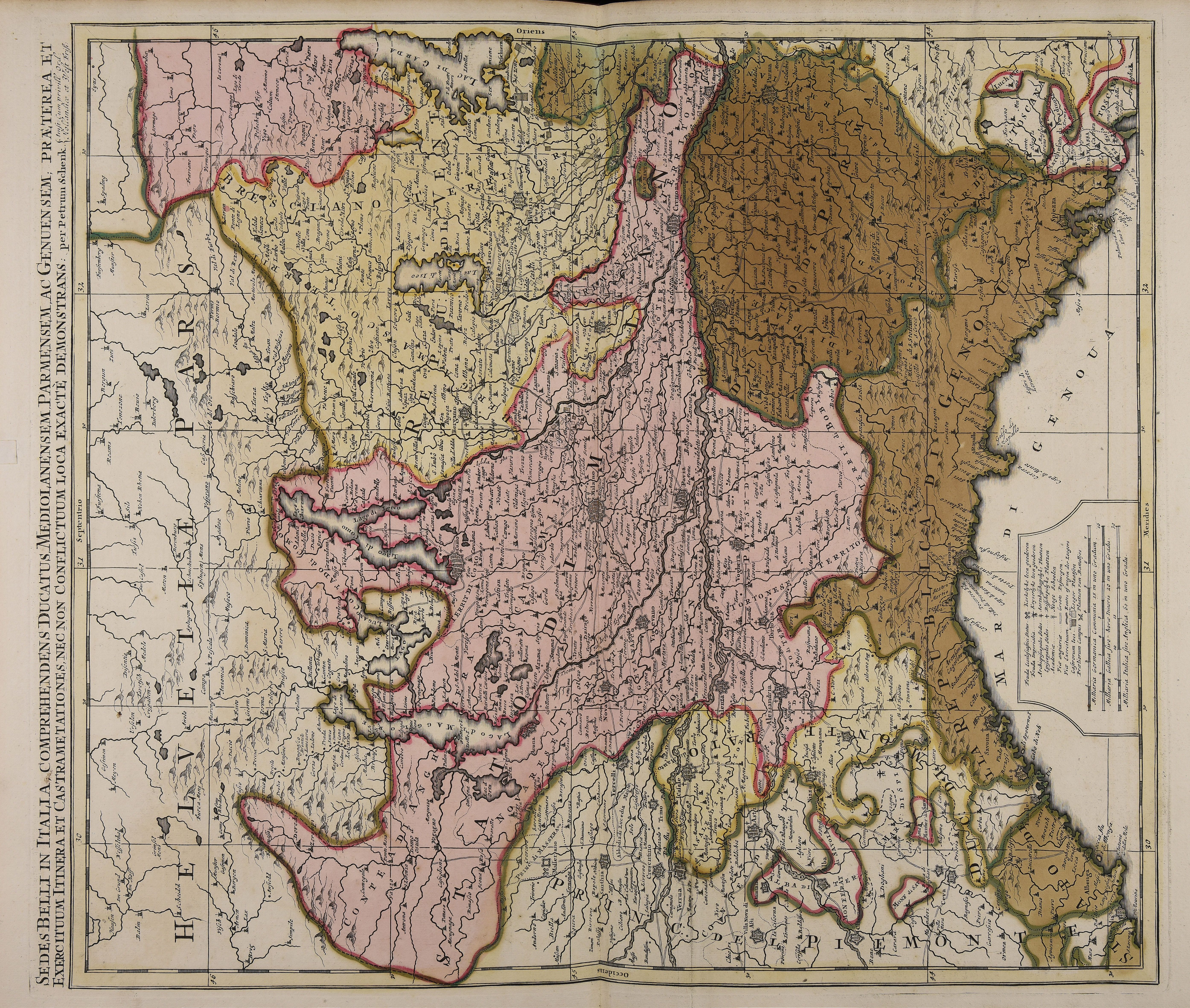Sedes belli in Italia comprehendens ducatus Mediolanensem, Parmensem ac Genuensem praeterea et exercituum itinera et castrametationes nec non conflictuum loca exactè demonstrans