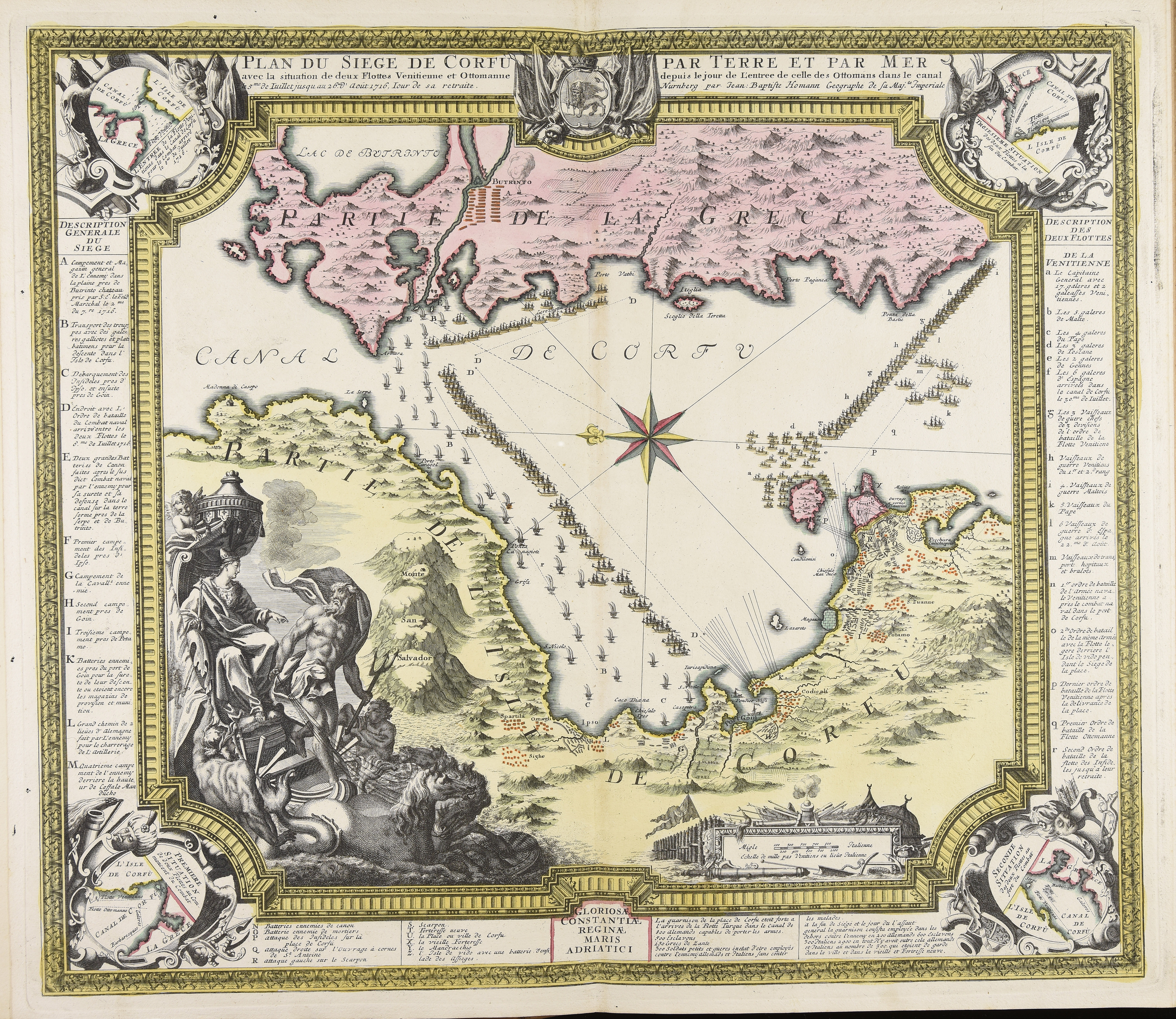 Plan du siege de Corfù par terre et par mer : avec la situation de deux flottes Venitienne et Ottomanne depuis le jour de l'entree de celle des Ottomans dans le canal le 5me de Iuillet jusqu'au 26.me d'Aout 1716 iour de sa retraite