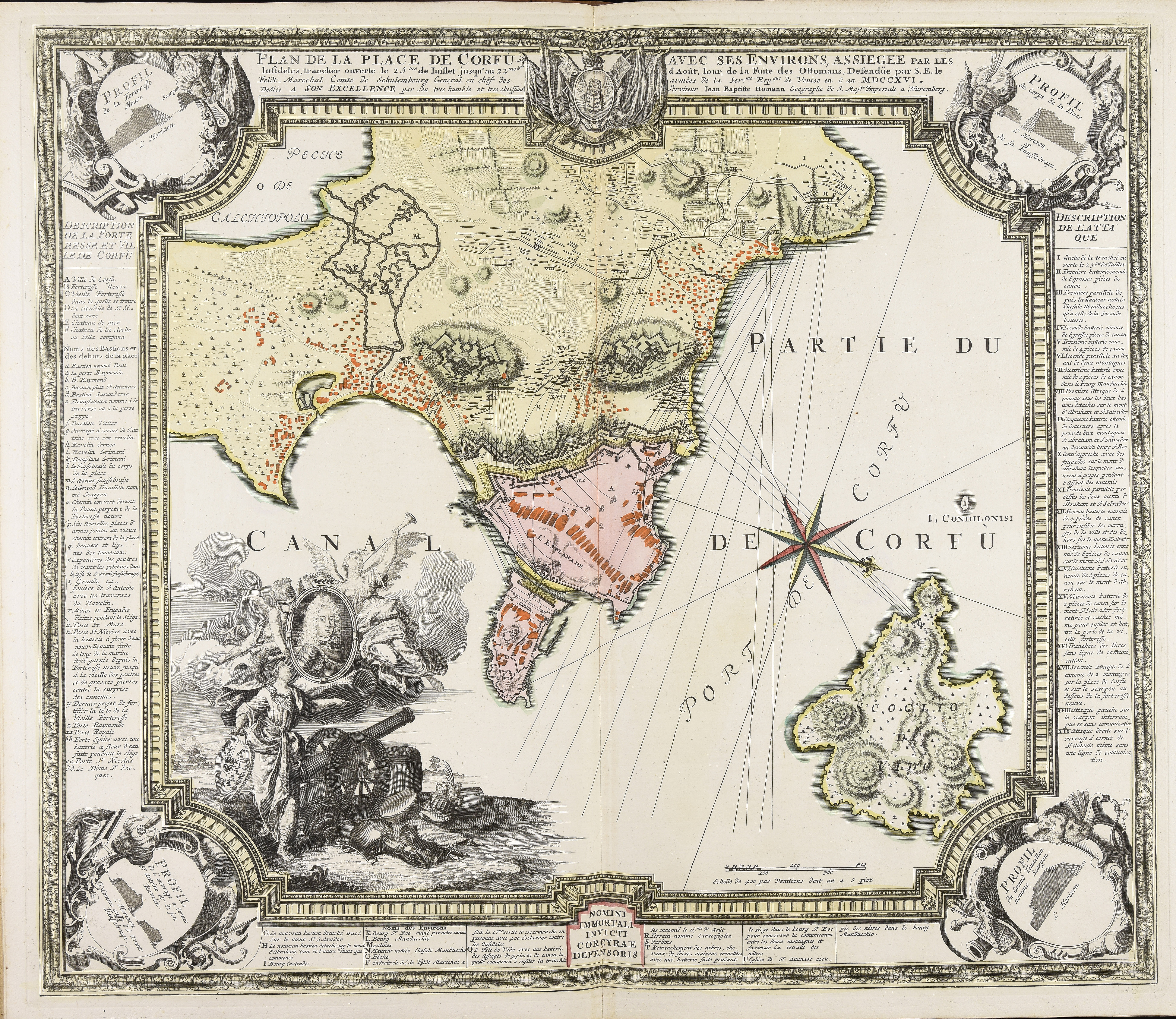 Plan de la place de Corfù avec ses environs assiegee par les infideles tranchee ouverte le 25me de Iuillet jusqu'au 22me d'Aout iour de la fuite des Ottomans defendüe par S.E. le feldt. marechal comte de Schulembourg general en chef des armées de la ser.m