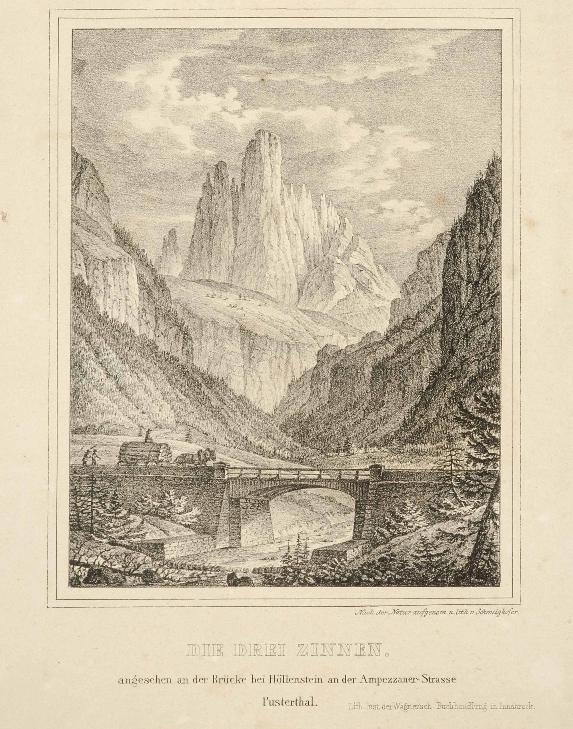 Die drei Zinnen angesehen an der Brücke bei Höllenstein an der Ampezzaner-Strasse Pusterthal