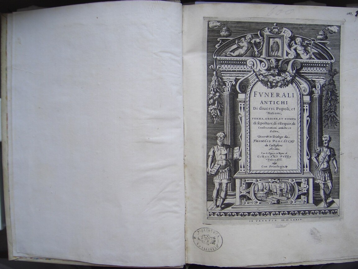 Porcacchi , Tommaso 1530c.-1585; Porcacchi , Thomaso, Funerali antichi di diuersi popoli, et nationi; forma, ordine, et pompa di sepolture, di essequie, di consecrationi antiche at d'altro, descritti in dialogo da Thomaso Porcacchi da Castiglione Arretino. Con le figure in rame di Girolamo Porro Padouano