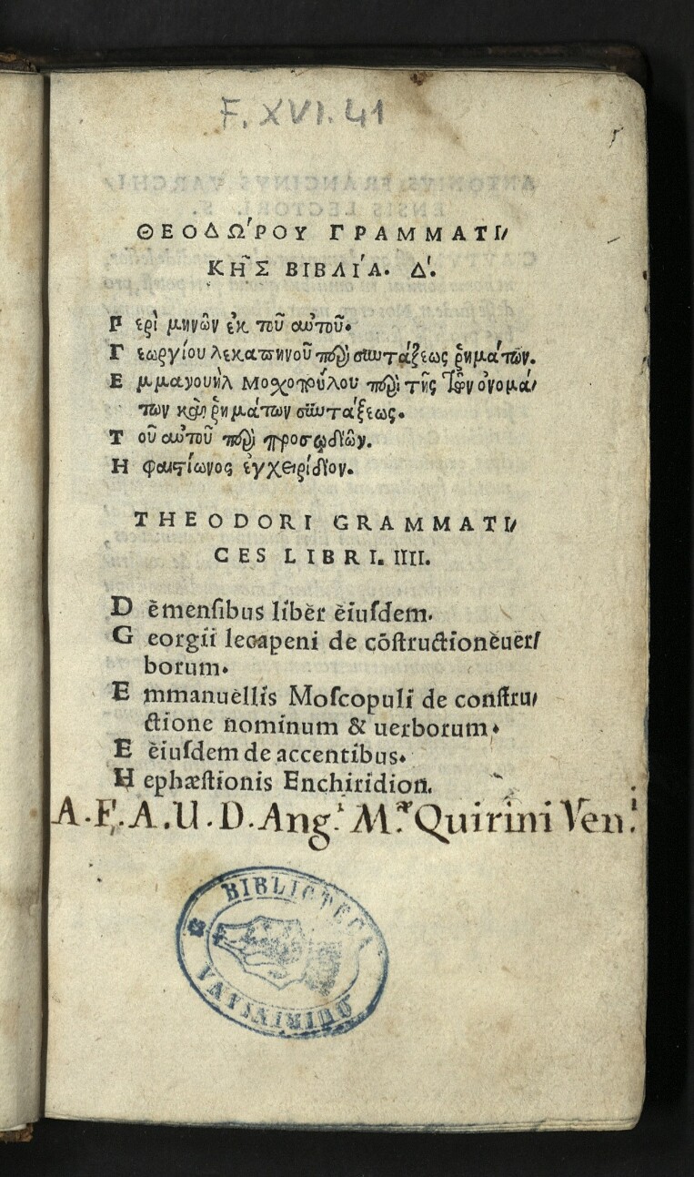 Theodorou Grammatikes Biblia. D'. ; Peri menon ek tou autou ; Georgiou Lekapenou peri suntaxeos rematon ; Emmanouel Mochopoulou peri tes ton onomaton kai rematon suntaxeos ; Tou autou peri prosodion ; Ephaistionos Encheiridion
