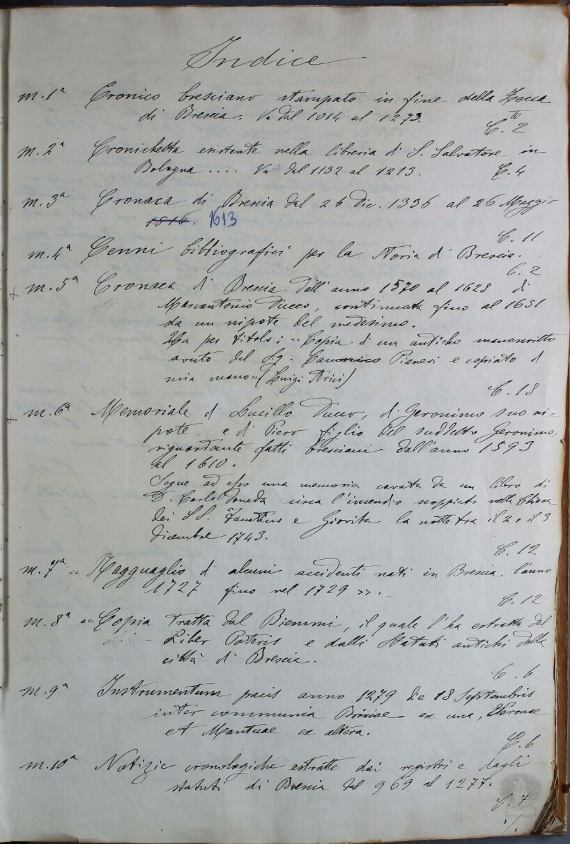 Cronico bresciano stampato in fine dalla zecca di Brescia. Cronachetta esistente nella Libreria di S. Salvatore in Bologna in carta pergamena scritta da uno che vivere in quel tempo per quanto apparisce dalle congetture e vuole il dottissimo P. Trombelli. Cronaca di Brescia dal 26 dicembre 1336 al 1516. Specie di estratto d'Annali bresciani cui manca il principio, e finisce con una memoria tratta dal Doneda. Copia di un anticho manoscritto avuto dal sig. canonico Pianori e copiato da mia mano. Memoriale di Lucillo Ducco di Geronimo suo nipote e di Pietro figlio del suddetto sig. Geronimo. Ragguaglio di alcuni accidenti nati in Brescia l'ano 1727 fino al 1729. Copia tratta dal Biemi quale l'ha estratta dal Lib. Poteris e dalli statuti antichi della città di Brescia. Instrumentum Pacis anno 1279 die 18 sept. inter Communia Brixiae ex una, Veronae et mantuae ex altera. Notizie cronologiche estratte dai registri e dagli statuti di Brescia dal 969 al 1277. Nomi e cognomi di quei bresciani che furono podestà in Milano, Piacenza e in Trevigi. Inventario di stampi nella filza Caranzoni dell'an. 1738. Decisioni prese in Brescia dal Consiglio speciale il 19 luglio 1532 e dal Consiglio generale il 13 agosto 1532. Stato di Brescia nel 1618. Estratti dagli Statuti di Brescia dall'anno 1277 al 1285. Note autenticative del diritto antico di patria potestà. Atti consigliari e documenti della comunità di Brescia appartenenti ai secoli XV e XVI. Atti del Consiglio generale di Brescia relativi al giudizio su questioni giuridiche tra cittadini. Lettera autografa in data 18 marzo 1829 alla Delegazione provinciale di Brescia. Nota cronologica di capitoli relativi a interessi dei comuni della provincia di Brescia 1492-1687. Copie di vertenze tra alcuni bresciani di città e di provincia in data 1586 e 1587. Tempi ne quali la città di Brescia è stata sotto il dominio di altri Principi, prima che sotto la Rep. di Venezia. Descrizione della città di Brescia prima della fabbrica del baluardo di Canton Mombello, cioè prima dell'anno 1547. Zibaldone di Cronica imperfetta