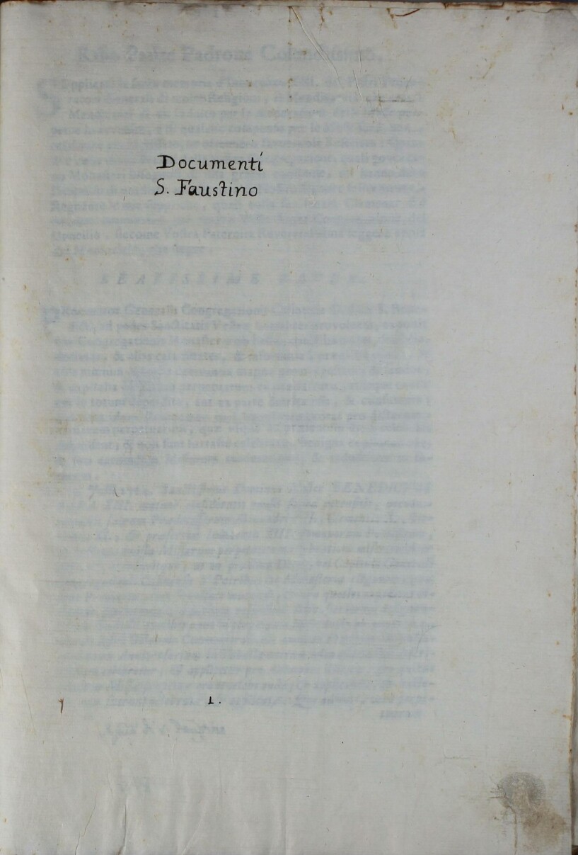 Documenti per le messe di S. Faustino di Brescia. Onera missarum ecclesiae parrocchialis Ranchi pleno iurae subiectae Monasterio SS. Faustini et Jovitae Brixiae. Anniversari per la sagrestia di S. Fausto. Anniversari per la celebrazione delle messe. Esposizione per la riduzzione delle messe di S. Faustino. Parere S. Faustino. Documenti per l'oblighi della parocchia di Bienno pleno iure soggetta al Monistero di S. Faustino di Brescia
