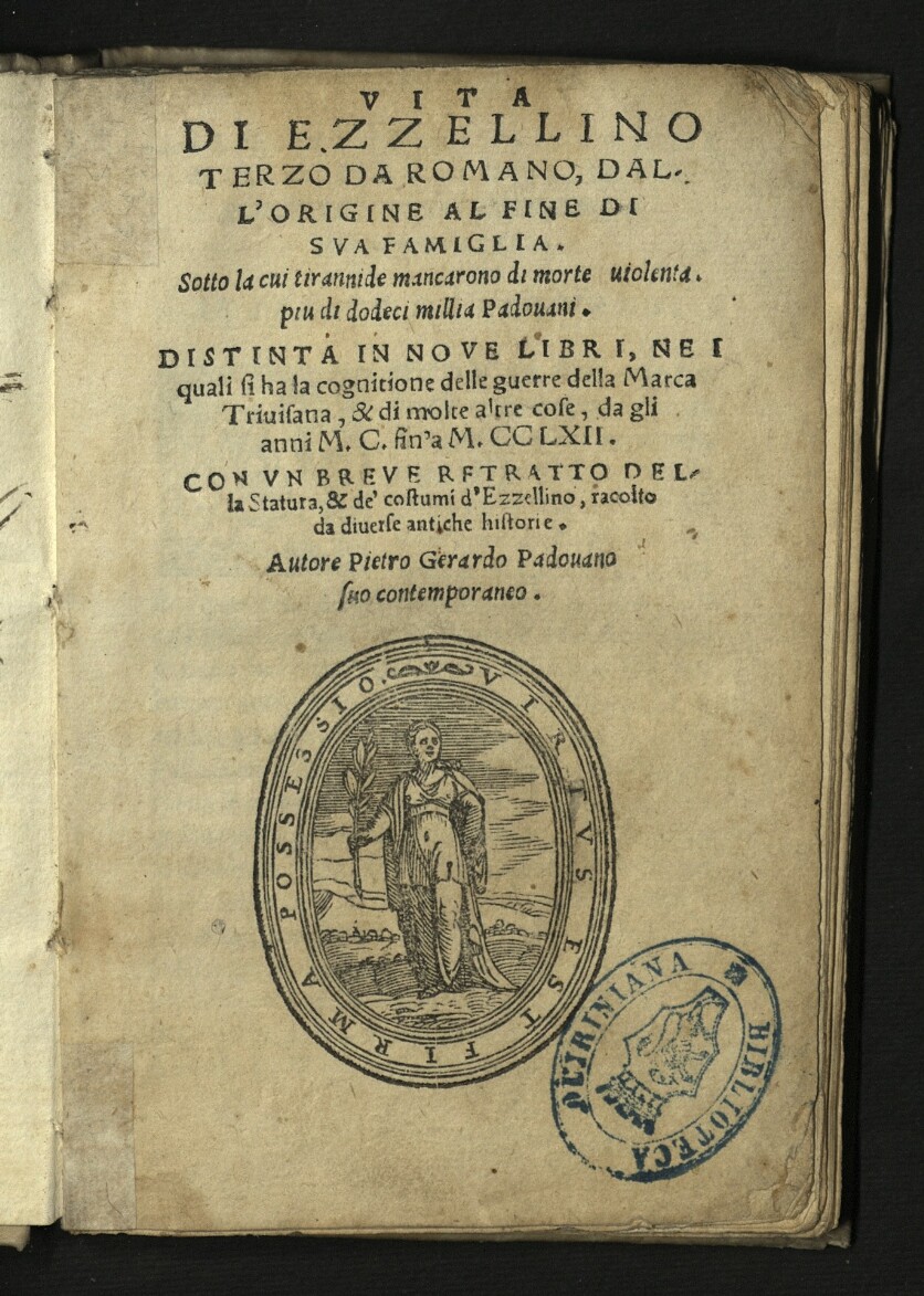 Gerardo, Pietro sec. 13., Vita di Ezzellino terzo da Romano, dall'origine al fine di sua famiglia; sotto la cui tirannide mancarono di morte uiolenta piu di dodeci millia padouani. Distinta in noue libri, ... Con un breue retratto della statura, de' costumi d'Ezzellino, ... Autore Pietro Gerardo padouano suo contemporaneo