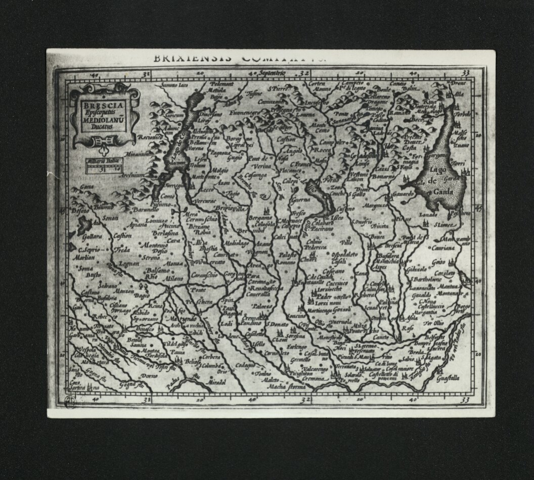 Fuori dalla cornice della stampa in alto, al centro: Brixiensis comitatus. A sinistra in alto entro cartiglio, il titolo; sotto, la scala. Riproduzione fotografica di una stampa del XVII sec.