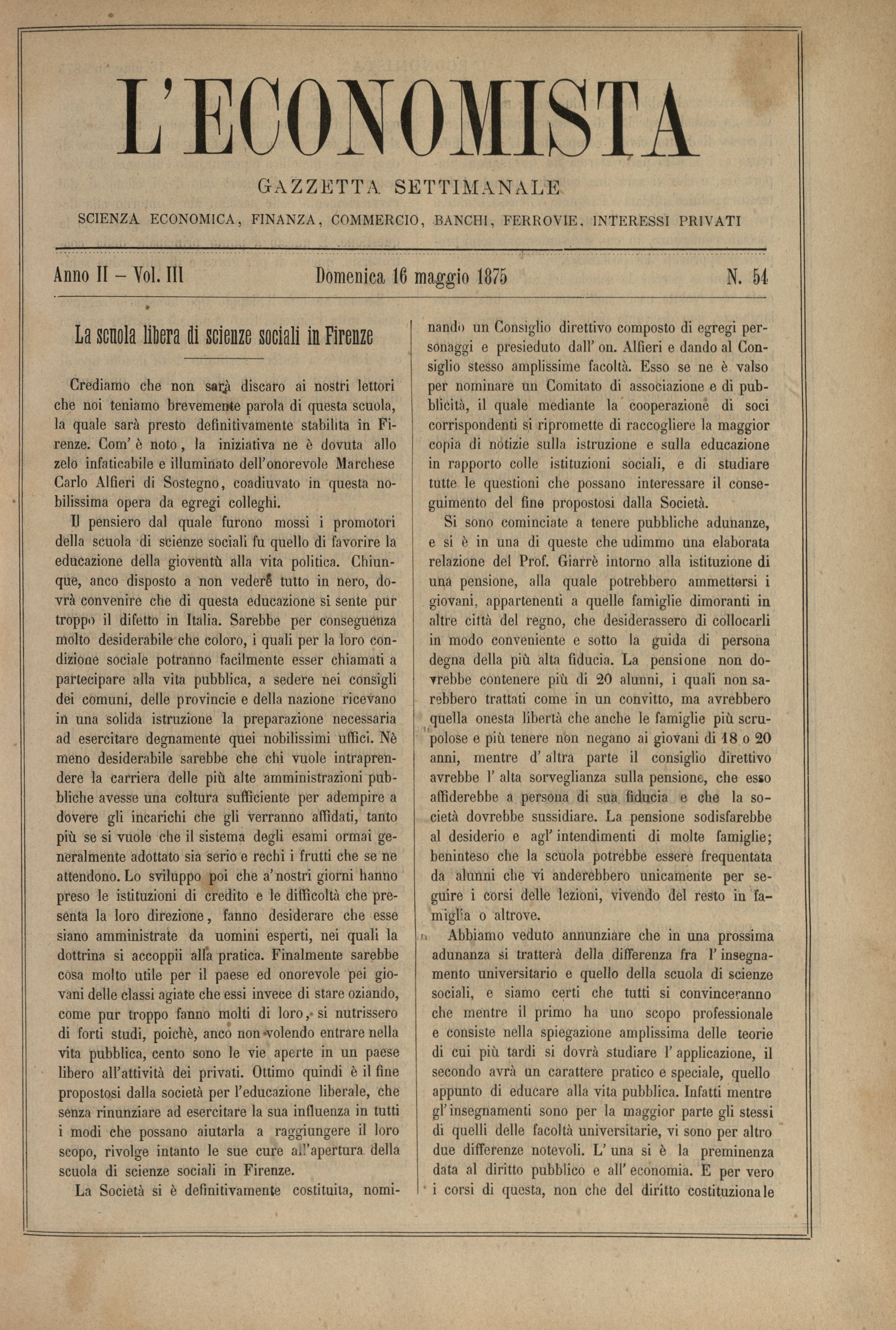 L'economista: gazzetta settimanale di scienza economica finanza commercio banchi ferrovie e degli interessi privati - A.02 (1875) n.54 16 maggio