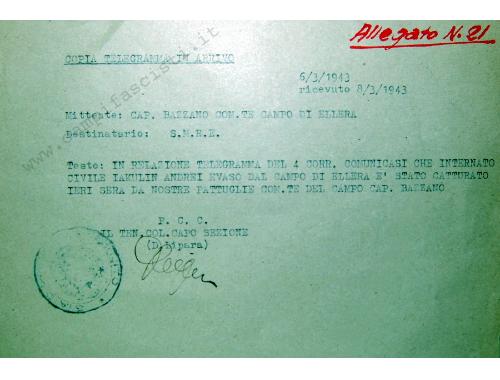 Telegramma cattura internato civile evaso dal campo concentramento di Ellera