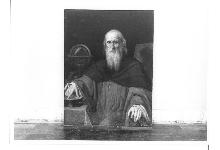 testa di astronomo con barba e turbante che misura un globo con un compasso. Gamma cromatica di verdi e rossi scuri data con pennellate brevi e ravvicinate. Forse il ritratto dell'astronomo Averra (Pittalis, p. 24). Cornice dorata con semplice scannellatura.