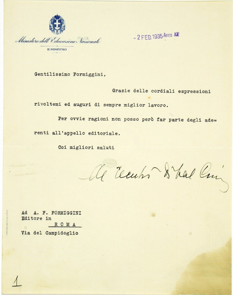 Lettere di De Vecchi di Val Cismon, Cesare Mario (1935 - 1938)