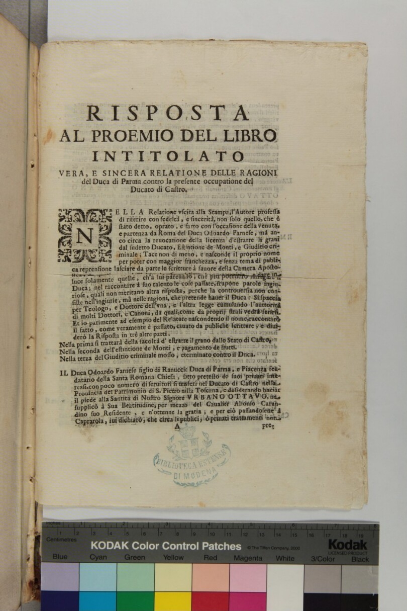 Risposta al proemio del libro intitolato vera, e sincera relatione delle ragioni del Duca di Parma contro la presente occupatione del Ducato di Castro.-[dopo il 1642].