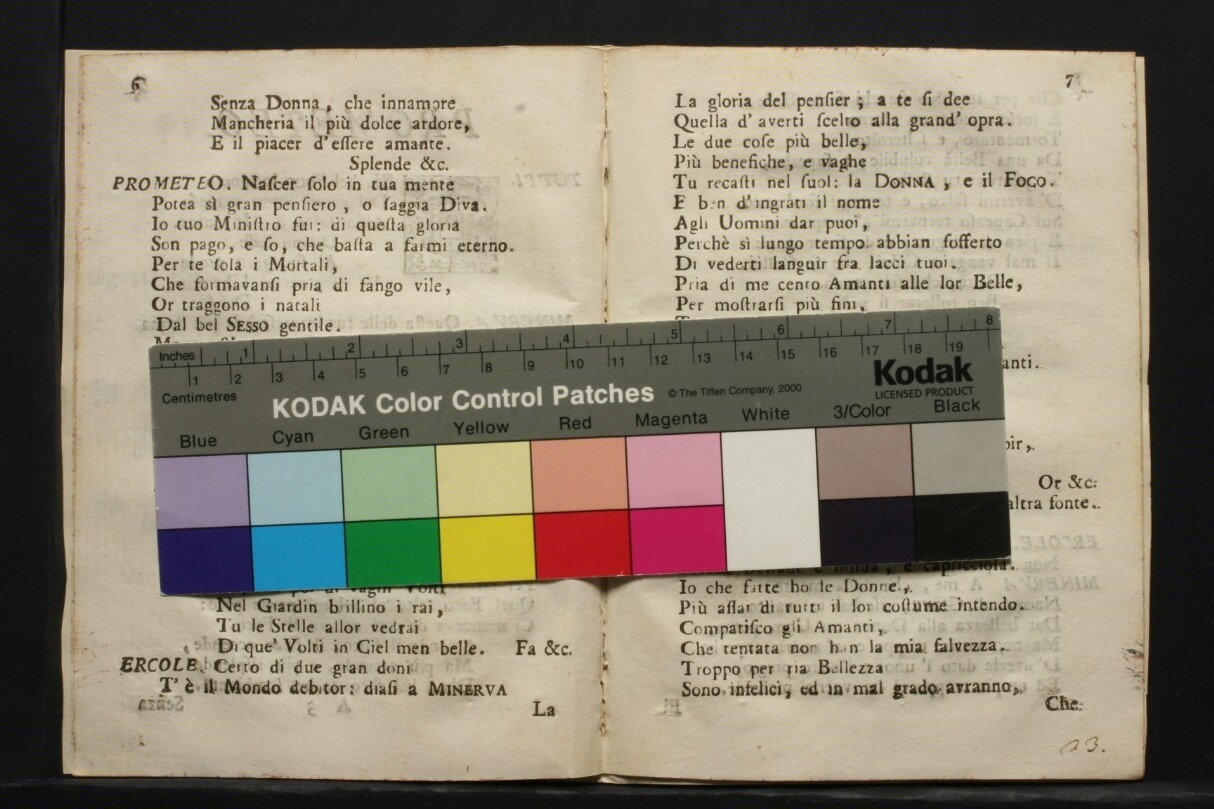 Prometeo serenata in onore de' due felicissimi giorni natalizj delle altezze serenissime delle principesse d'Este Benedetta, e Amalia.-In Modena : per Bartolomeo Soliani stampator ducale, 1728.