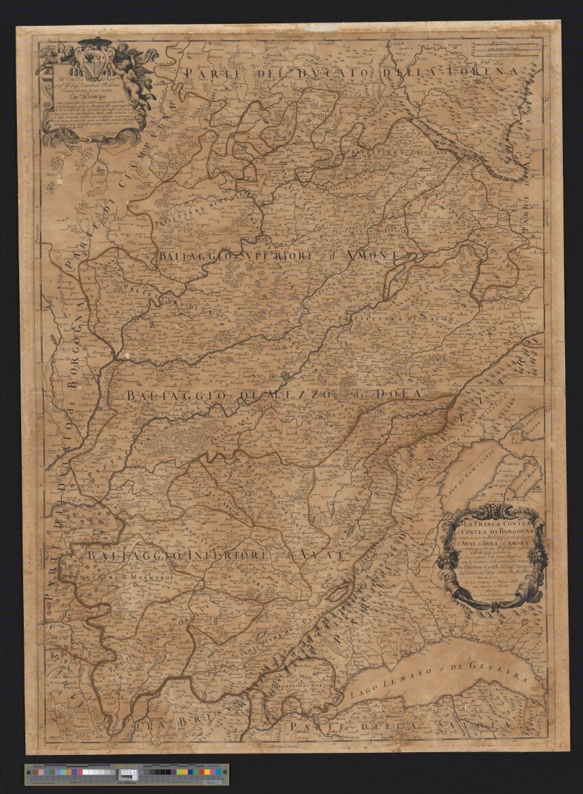 LA FRANCA CONTEA ò CONTEA DI BORGOGNA diuisa ne suoi tre Baliaggi principali, cioè d’AVAL di DOLA, e di AMONT e subdiuisa nelle sue Prefetture inferiori ò Baliaggi subalterni sù L’esemplare delle Carte Migliori, e con la diretione delle notizie più recenti da Giacomo Cantelli da Vig.(nol)a Geografo del Sereniss.(imo) Sig.(no)r Duca di Modena e data in Luce Da Gio.(vanni) Giacomo de Rossi, dalle sue stampe in Roma alla Pace con Privil.(egio) del Som.(mo) Pont.(efice) L’Anno 1690.