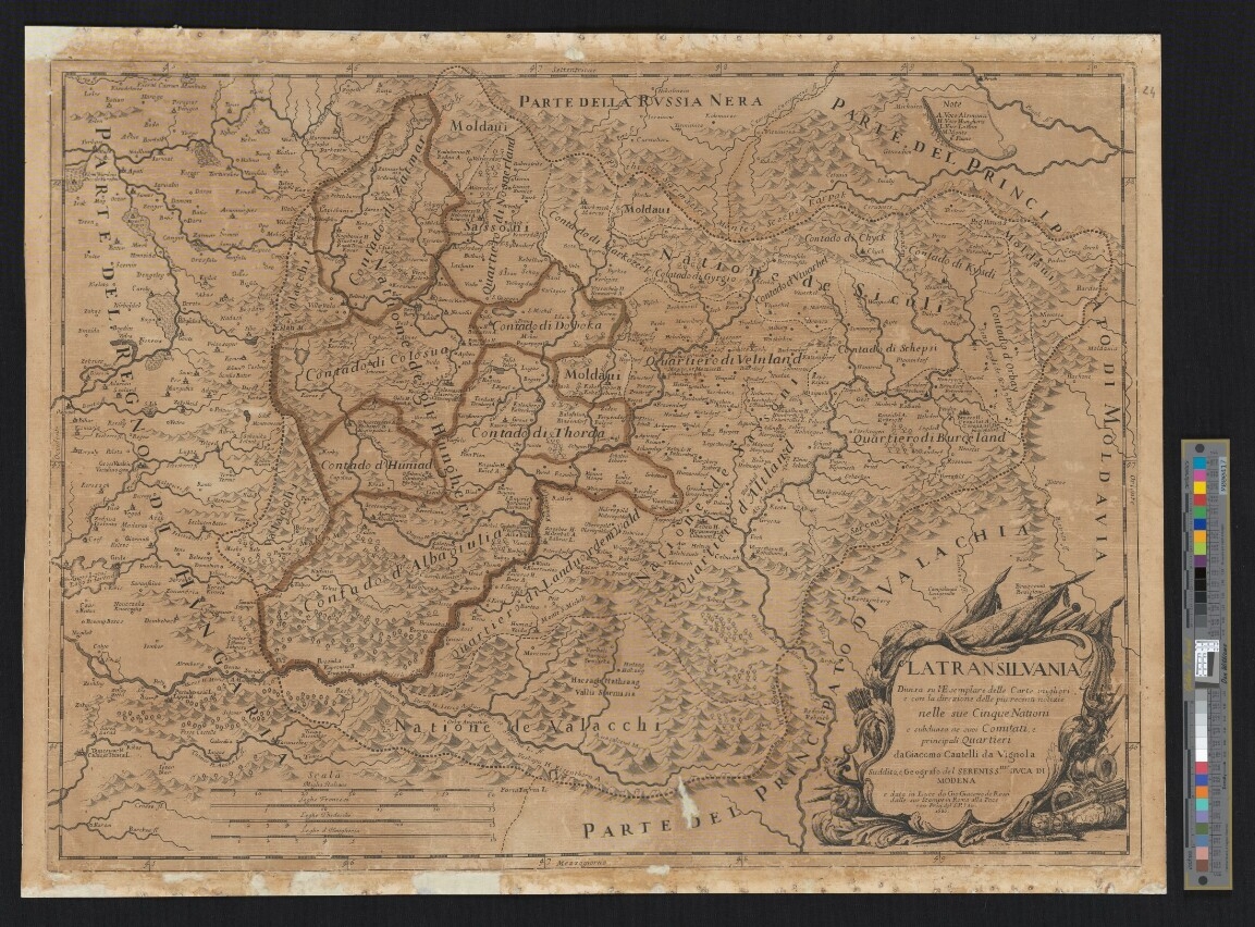 LA TRANSILVANIA Diuisa su l'Esemplare delle Carte migliori e con la direzione delle più recenti notizie nelle sue Cinque Nationi e subdiuisa ne suoi Comitati e principali Quartieri da Giacomo Cantelli da Vignola Suddito, e Geografo del SERENISS.(I)mo DVCA DI MODENA e data in Luce da Gio:(vanni) Giacomo de Rossi dalle sue Stampe in Roma alla Pace con Priu.(ilegio )del S.(ommo) P.(ontefice) l'An.(no) 1686.