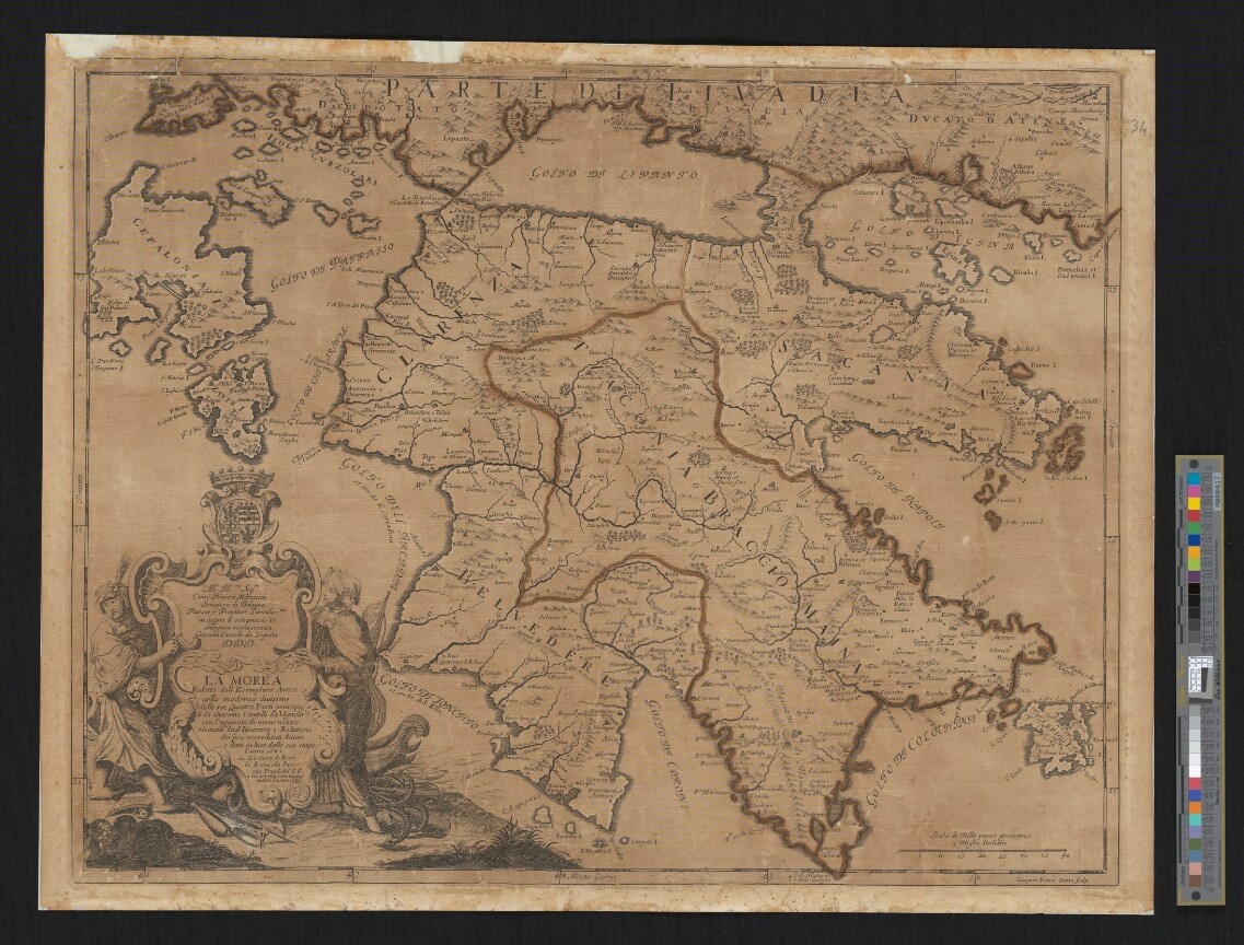 LA MOREA Ridotta dall Esempare Antico nella modenra diuisione delle sue Quattro Parti principali da Giacomo Cantelli da Vignola con l'aggiunta di nuoue notizie ricauate dagl Itinerary e Relationi dei piu accreditati Autori e data in luce dalle sue stape l'anno 1685. da Gio:(vanni) Giaco:(mo) de Rossi In Roma alla Pace con Priuil.(egi)o del S.(ommo) P.(ontefice) e ricorretta con nuoue notitie l'anno 1686.