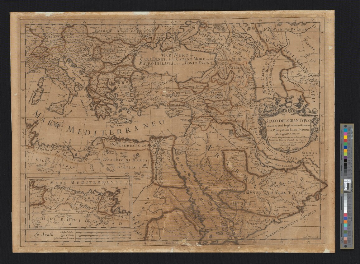 STATO DEL GRAN TVRCO diuiso ne suoi Berglierbati, o Gouerni, e ne Principati, che li sono Tributari, da Guglielmo Sansone. E di nuouo dissegnata, et accomodata all'Idioma Italiano, da Giacomo Cantelli da Vignola. E data in luce da Gio.(vanni) Giacomo (de) Rossi, in Roma, alla Pace, co(n) Pr.(ivilegio) del S.(ommo) P.(ontefice) 1679.
