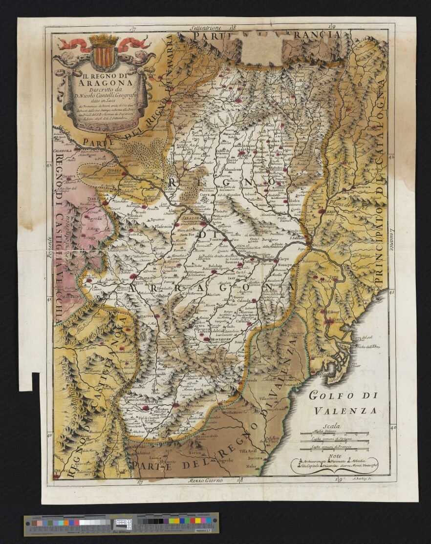 IL REGNO DI ARAGONA Descritto da D. Nicoò Cantelli Geografo dato in Luce da Domenico de Rossi ere di Gio.(vanni) Giac.(om)o de Rossi dalle sue Stampe in Roma alla Pace con Priuil(egio) del S.(ommo) P.(ontefice) e licenza de Superiore l'Anno 1696, il di 1° Settembre