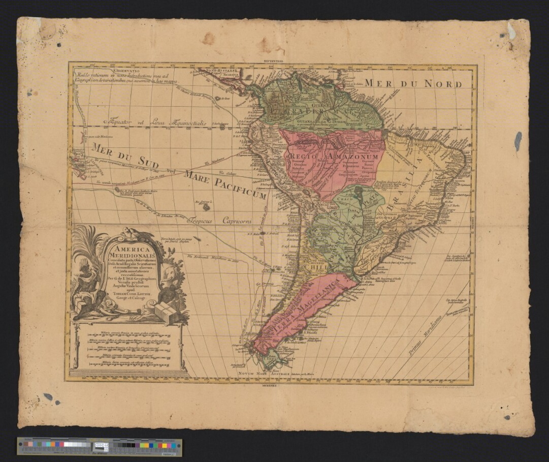 AMERICA MERIDIONALIS Concinnata juxta Observationes Dnn Acad(emiae) Regalis Scientiarum et nonnullorum aliorum, et juxta annotationes recentissimas. Per G.(UILLAUME) de L'ISLE Geographum Venalis prostat Augustae Vindelicorum apud TOBIAM CONR.(AD) LOTTER Geogr.(aphum) et Calcogr.(aphus)