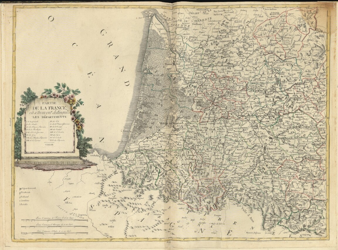 PARTIE DE LA FRANCE oùsetrovent distinguès LES DÈPARTEMENTS I. de la Gorinde II. des Landes III. des Basses Pyrenèes IV. de la Dordogne V. du Lot et Garonne VI. du Gers VII. des Hautes Pyrenèes VIII. de la Correze IX. du Lot X. de la Haute Garonne XI. de l’Arriége XII. du Cantal XIII. de l’Aveiron XIV. du Tarn XV. de l’Aude XVI. des Pyrenèes VENISE