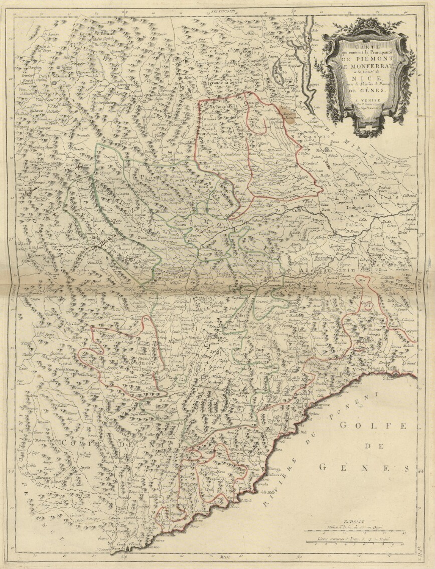 CARTE qui contient la Principauté DE PIÉMONT, LE MONFERRAT, et la Comté de NICE, avec la Rivière de Ponent DE GÈNES. A VENISE Par P.(aolo) Santini 1779 Au Neg.(oce) Remondini