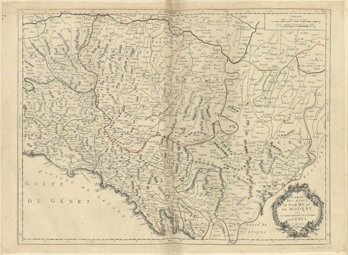 CARTE DES ETATS DE PARME, ET DE MODÈNE, avec LA PARTIE ORIENTALE DE LA RIVIÈRE DE GÈNES. À VENISE Par P(aolo) Santini 1779 Chez M.(onsieur) Remondini.