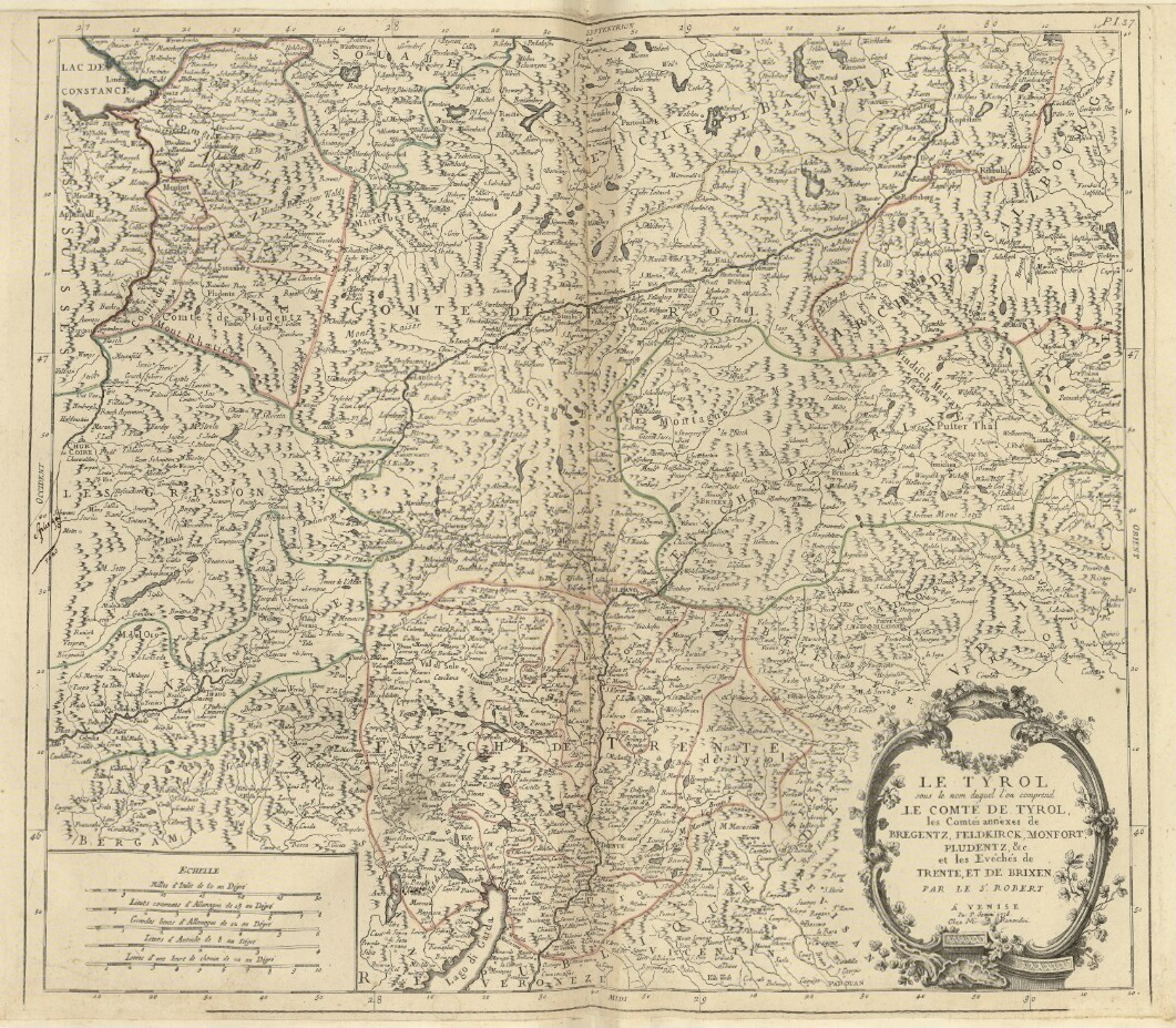 LE TYROL sous le nom duquel l’on comprend LE COMTÉ DE TYROL, le Comtés annèxes de BREGENTS, FELDKIRCK, MONFORT, PLUDENTS, c. et les Evêchés de TRENTE, ET DE BRIXEN PAR LE S.(ieu)r ROBERT (DE VAUGONDY) À VENISE Par P(aolo) Santini 1778 Chez M.(onsieur) Remondini.