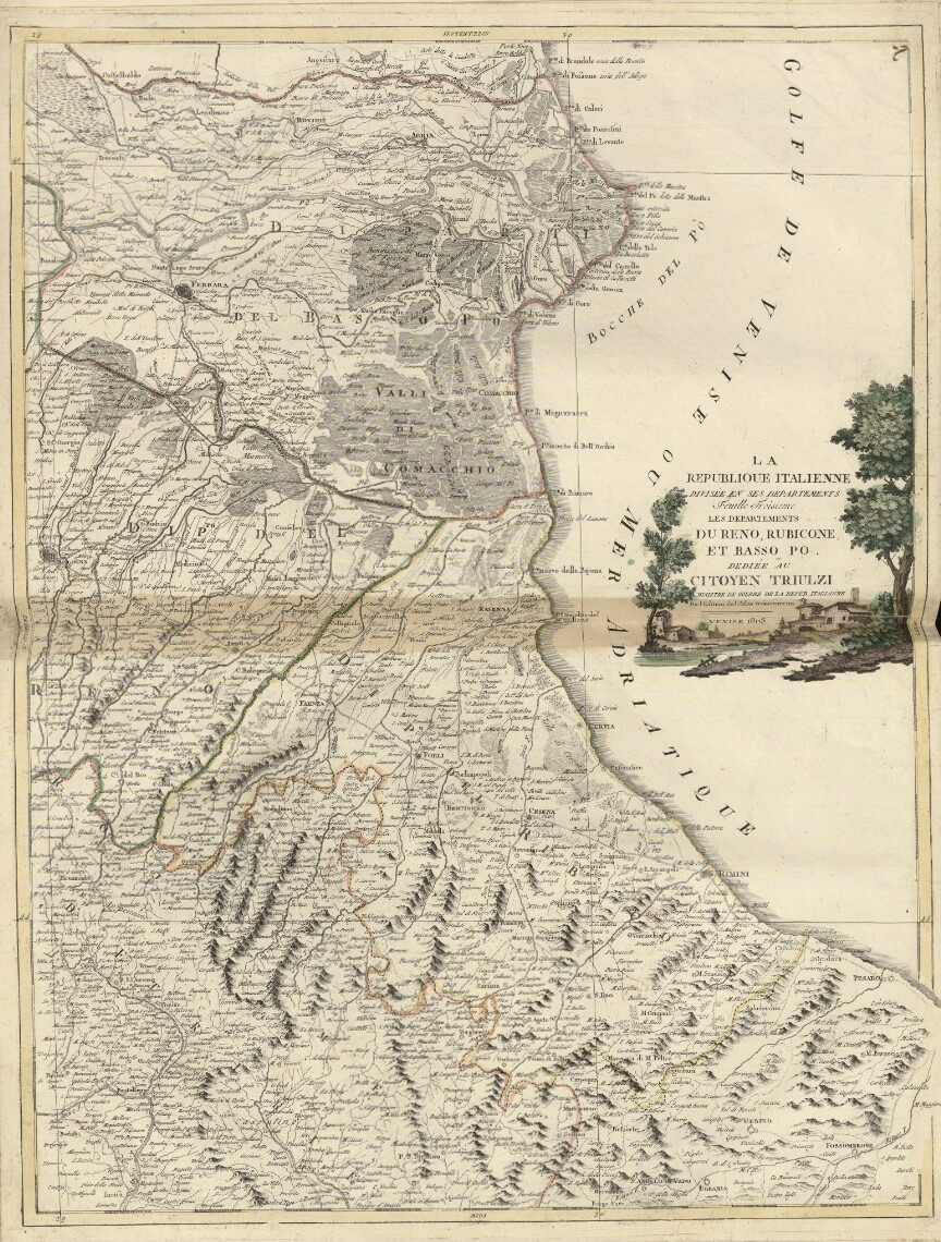 LA REPUBLIQUE ITALIENNE DIVISÉE EN SES DEPARTEMENTS Feuille Troisieme LES DEPARTEMENTS DU RENO, RUBICONE, ET BASSO PO DEDIÉE AU CITOYEN TRIULZI MINISTRE DE GUERRE DE LA REPUB.(LIQUE) ITALIENNE par l'editeur de l'atlas trés nouveau VENISE 1803