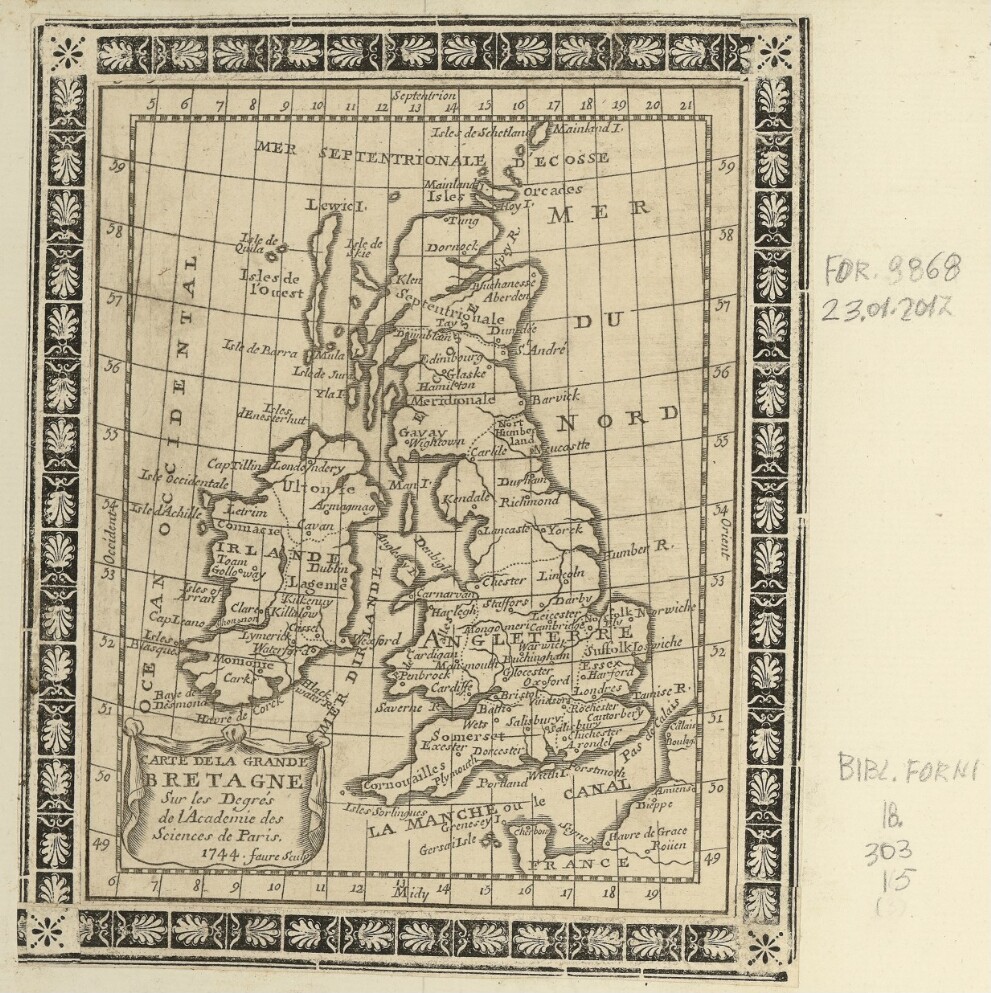 CARTE DELA GRANDE BRETAGNE Sur les Degrés de l'Academie des Sciences de Paris. 1744. faure Sculp.(sit)