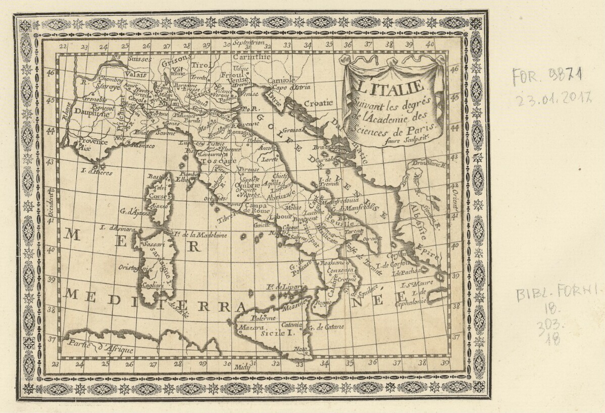 L'ITALIE Suivant les degrés de l'Academie des Sciences de Paris. faure Sculpsit.