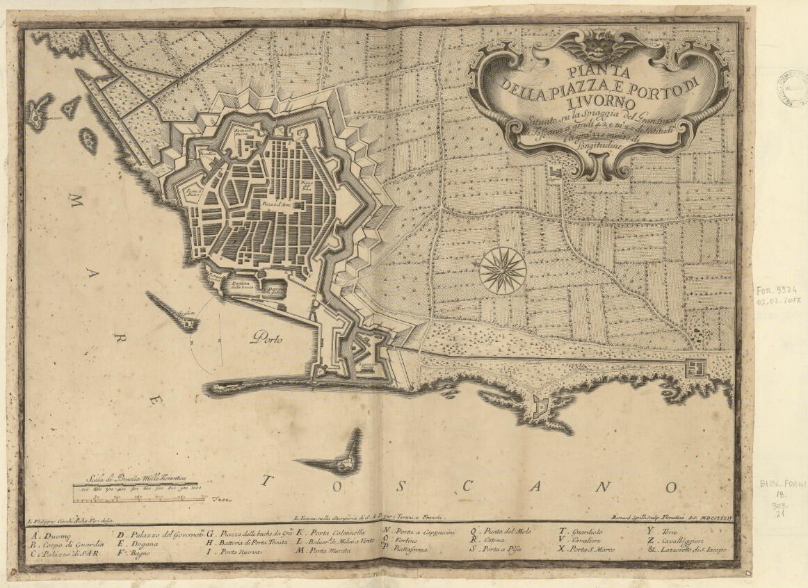 PIANTA DELLA PIAZZA E PORTO DI LIVORNO Situato su la Spiaggia del Gran Duca di Toscana a gradi 42 e m(inuti) 20 di Latitudi(ne) e a gra(di) 33 e min(uti) 10 di Longitudine
