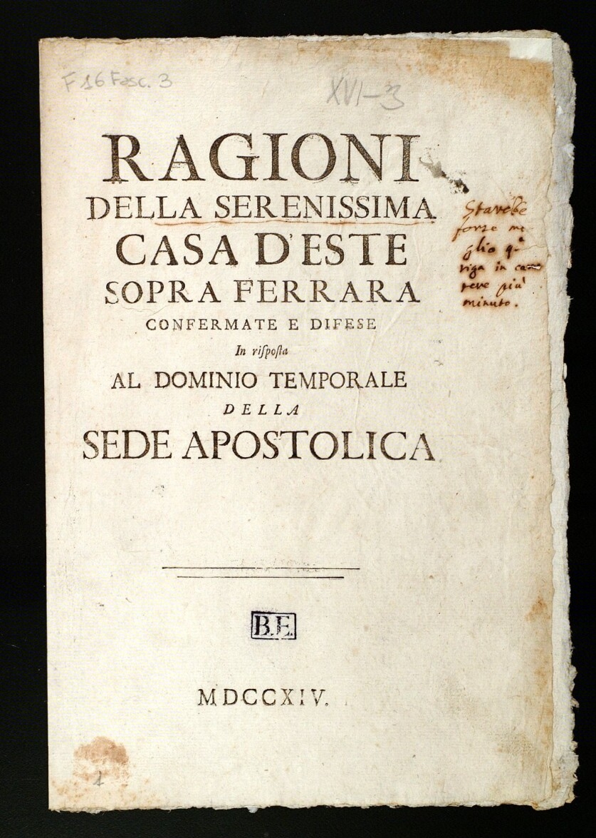 Ragioni della serenissima casa d'Este sopra Ferrara confermate e difese in risposta al dominio temporale della Sede apostolica (1714)