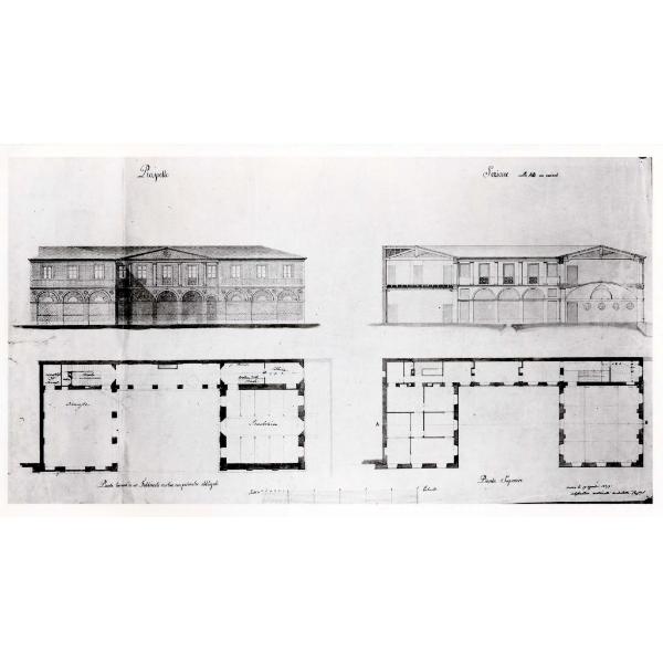 Progetto d'un fabbricatato rustico - Prospetto, piante e sezione