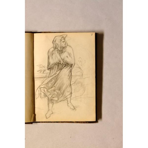 Vecchia stante, in mantello svolazzante