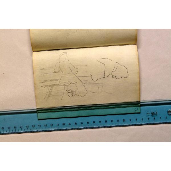 Figura seduta, mezza figura incappucciata, di profilo