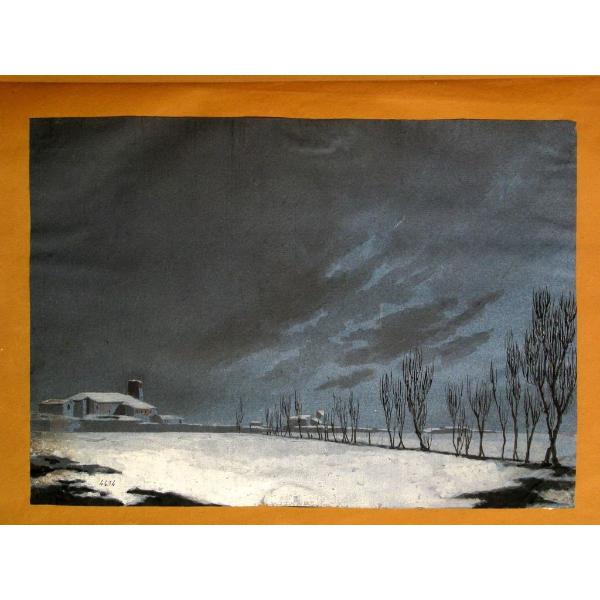 Pianura sotto la neve con gruppi di fabbricati sullo sfondo e filari d'alberi spogli