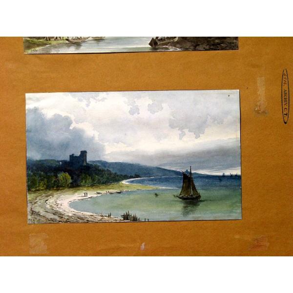 Vista di lago con numerose barche a vela e castello fra boschi sulla riva
