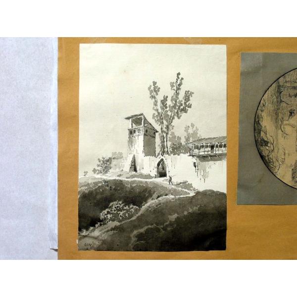 Schizzo di vecchi edifici con torre e loggetta rustica sul muro di cinta