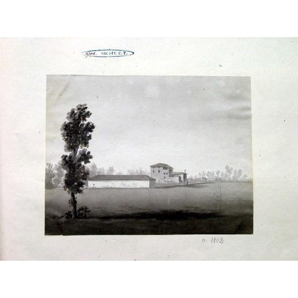 Grande cascinale in pianura con resti di castello nella parte centrale