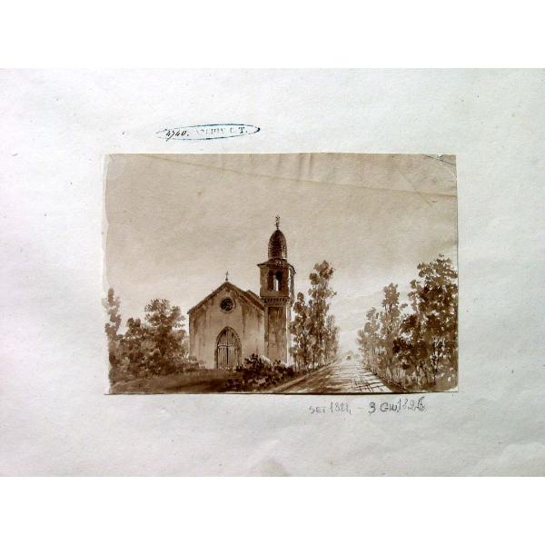 Cedriano - Borgo sulla strada da Boffalora a Milano, chiesa con campanile al margine della strada