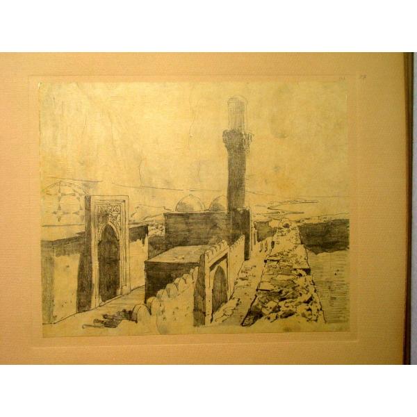 Veduta di costruzioni cupolate e minareto all'interno di una cinta di mura - golfo in distanza