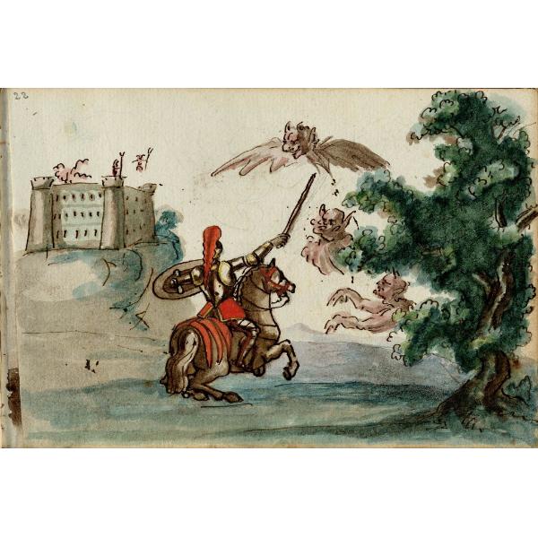 Scontro di cavaliere con mostri alati e castello sullo sfondo
