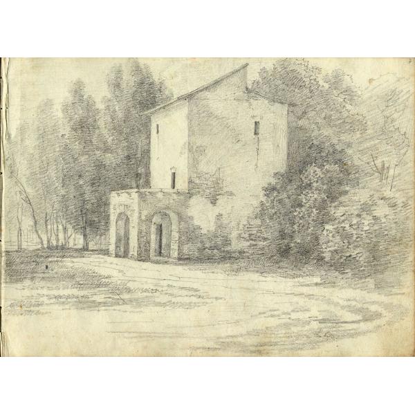 Honorati Gaudenzio (notizie seconda metà sec. XVIII-primo quarto sec. XIX) , studio di edificio porticato con fontana
