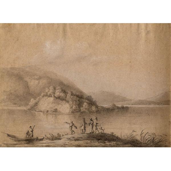 Paesaggio lacustre con isola e figure in primo piano